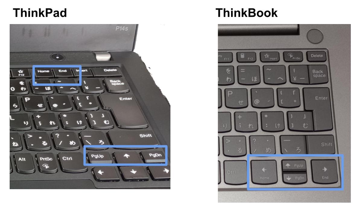 キー配列で決定的に違うのは、 ThinkPad は Page Up/Page Down、Home/End のキーが独立しているのに対して、ThinkBook はこれらのキーはすべて Function キーとの組み合わせで機能します。この配置は13型でも15型でも同じです。